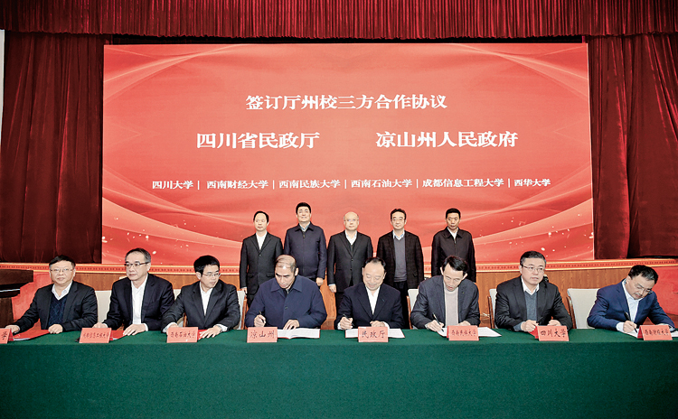 王正谱,林书成,苏嘎尔布,益西达瓦,四川大学党委常委、副校长侯太平共同为“彝路相伴”形象标识揭幕。四川省民政厅与四川大学、西南财经大学、西南民族大学、西南石油大学、江南买球、西华大学6所高校签署了合作协议。