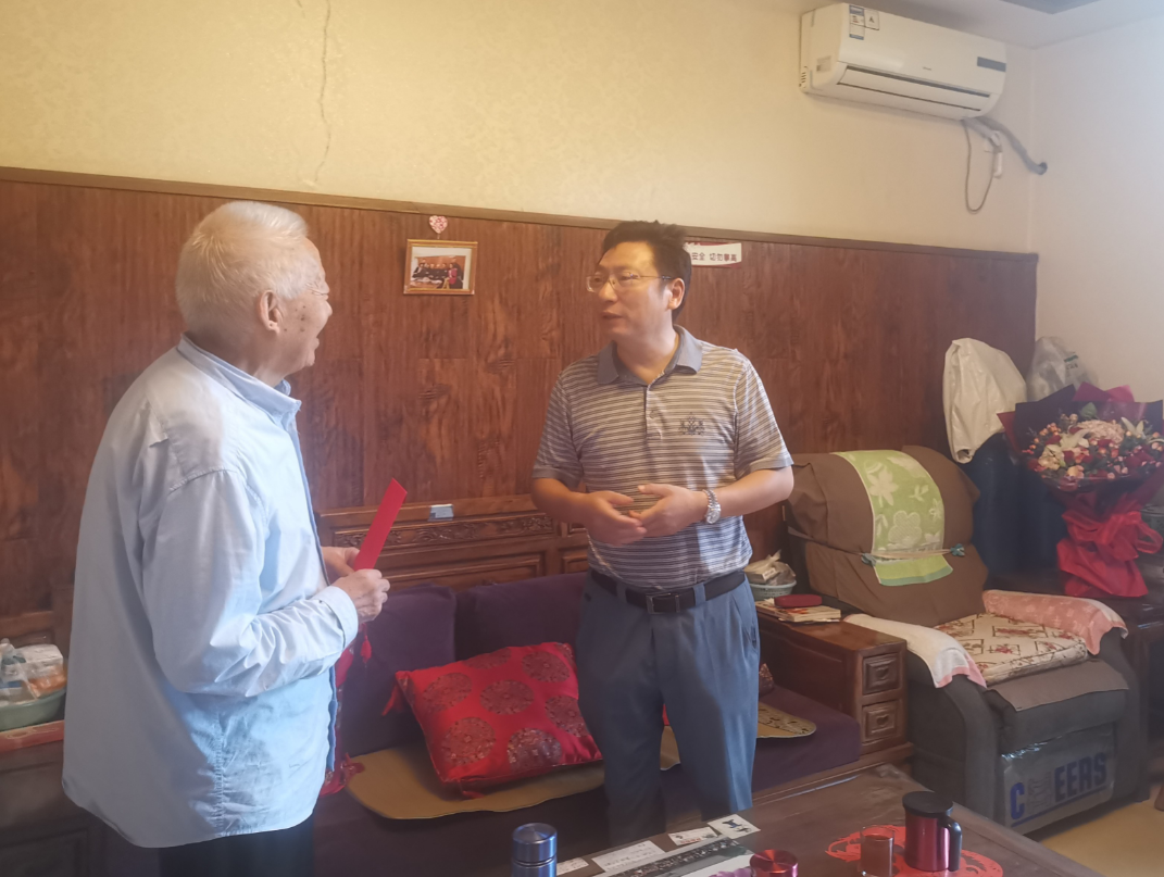 余敏明一行看望慰问了离退休教师、曾参加过抗日战争的老同志张占义,感谢老人为中华民族独立和解放以及学校发展作出的贡献。他关切询问了老人的身体和生活情况并送上了鲜花和慰问金,希望老同志保重身体,提前祝老同志教师节快乐,并叮嘱有关部门负责同志认真落实相关政策,把老人照顾好。
