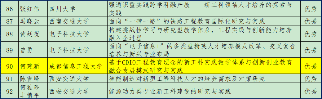 【本网讯】近日,《教育部办公厅关于公布首批新工科研究与实践项目结题验收结果的通知》(教高函〔2020〕12号)发布,我校由副校长何建新教授主持的首批教育部新工科项目“基于CDIO工程教育理念的新工科实践教学体系与创新创业教育融合发展模式研究与实践”结题验收结果为优秀。首批国家级新工科研究与实践项目共612项,有589项通过验收,其中优秀项目96项。