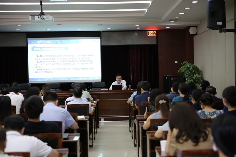 【本网讯】6月29日,“新形势下招投标的规范与要求”培训会在航空港校区行政楼第一会议室举行。省纪委监委驻校纪检监察组组长,学校党委副书记、纪委书记雷超作专题报告,副校长于世祥主持会议。学校各职能部门主要负责人、各二级学院院长、分管实验室建设的副院长、资产经营公司负责人、资产管理处(招投标中心)全体工作人员参加了培训。