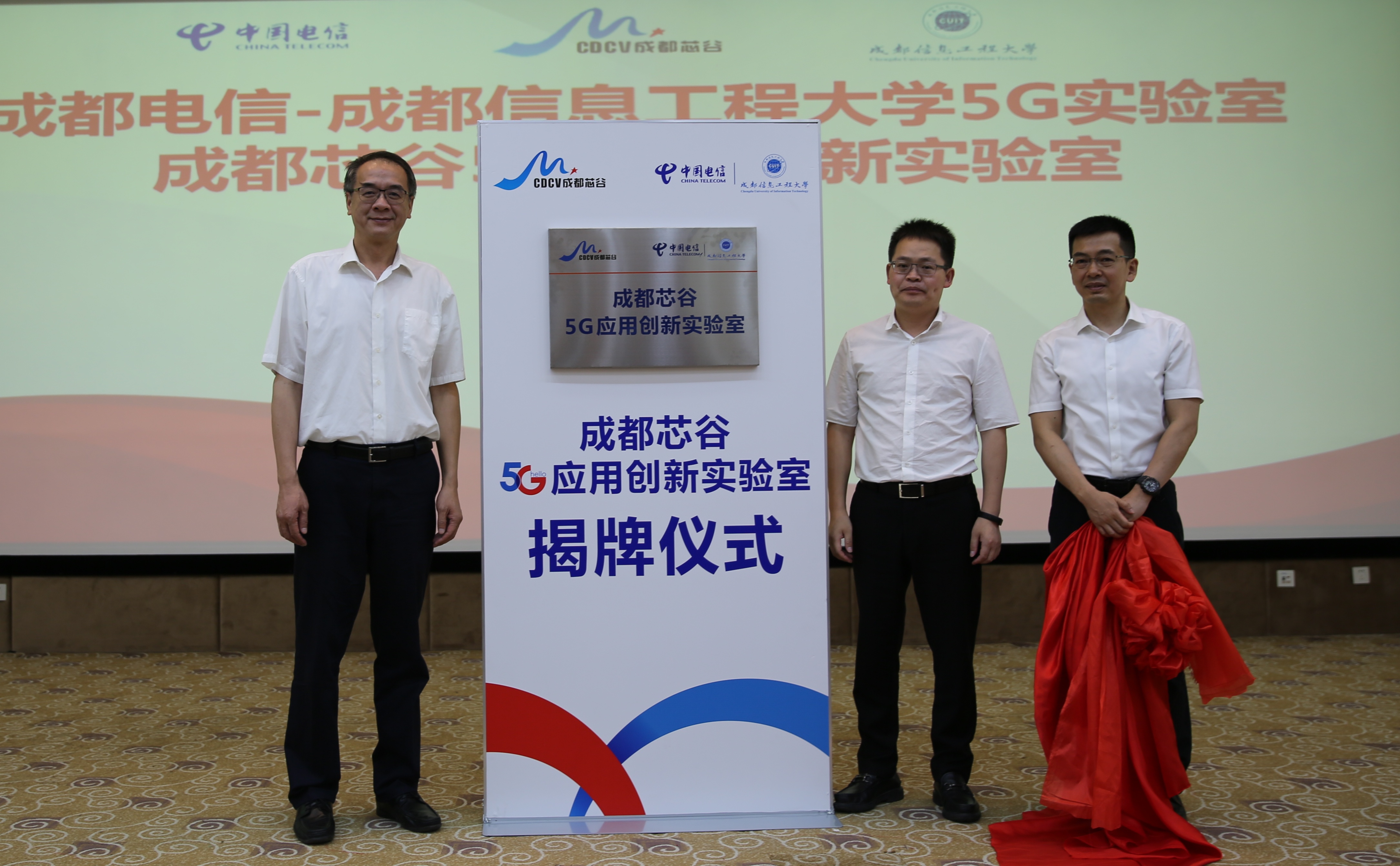 余敏明、杨洋为“成都电信-江南买球5G实验室”揭牌。韩超、余敏明、杨洋为“成都芯谷5G应用创新实验室”揭牌。