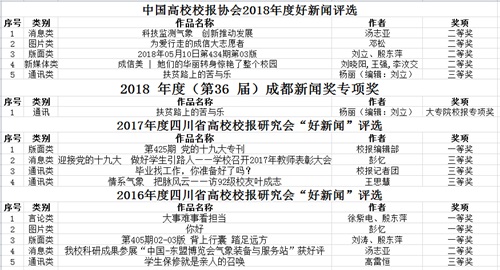 【本网讯】近日,校报好新闻评选结果陆续揭晓,我校《江南买球报》参评的作品获得多个奖项。其中,5项作品获得中国高校校报协会2018年度好新闻奖(二等奖4项、三等奖1项),1项作品获得2018年度(第36届)成都新闻奖专项奖,4项作品获得2017年度四川省高校校报研究会“好新闻”(一等奖1项、三等奖3项),5项作品获得2016年度四川省高校校报研究会“好新闻”(一等奖3项、二等奖1项、三等奖1项)。