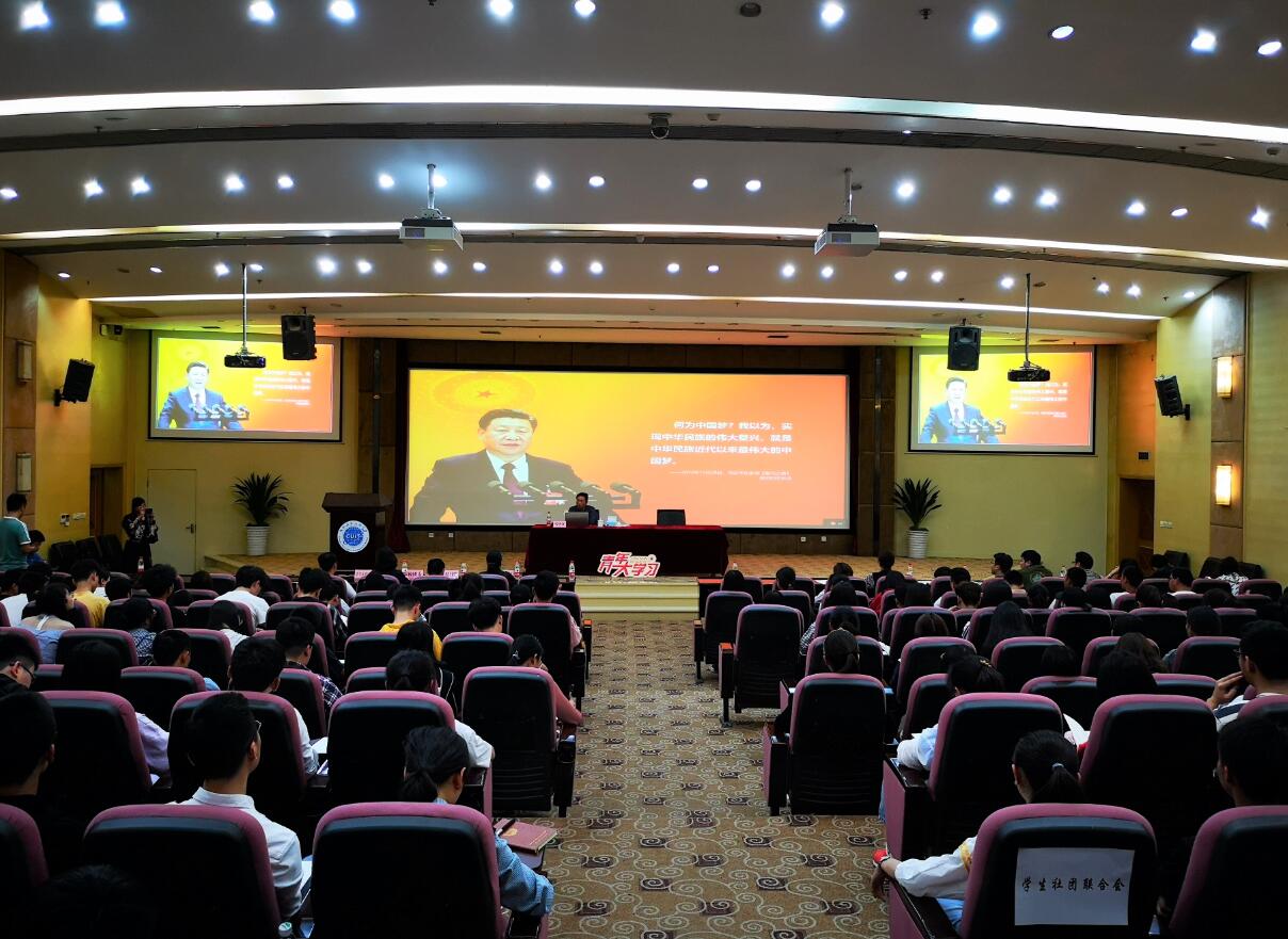 马洪江从历史渊源、现实背景、内容本质、实现路径等方面对美丽“中国梦”进行了详细阐述,对“中国梦”的重大意义、核心要义和丰富内涵进行了充分的讲解,并重点就习近平新时代中国特色社会主义思想贯穿的鲜明人民立场,习近平时代观、发展观、奋斗幸福观以及蕴含其中的科学思想方法和工作方法进行了深入浅出的阐释。他强调,青年大学生是中国特色社会主义事业的建设者和接班人,必须坚持用习近平新时代中国特色社会主义思想武装头脑,更加自觉地在思想上政治上行动上同以习近平同志为核心的党中央保持高度一致,努力成长为坚定的马克思主义者。
