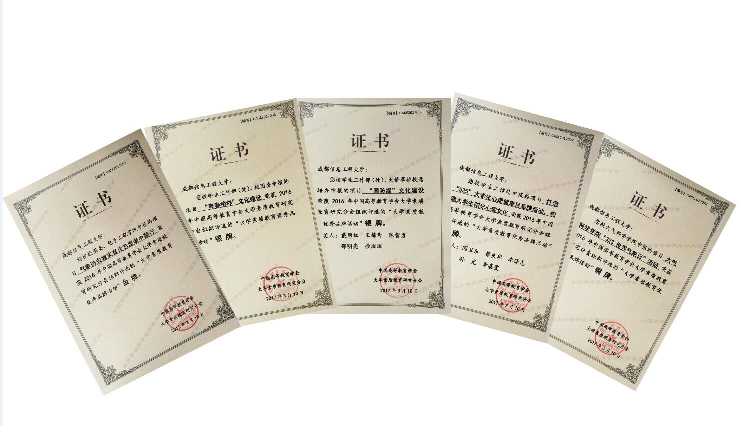 论坛开幕式上公布了2016年大学素质教育优秀品牌活动评选结果并进行了颁奖。全国共有135个项目分别获得金、银、铜牌,我校团委、电子工程学院申报的“气象防灾减宣传志愿者中国行”荣获金牌;学生工作处、校团委申报的“青春榜样文化建设”和学生工作处、火箭军驻校选培办申报的“国防绿文化建设”荣获银牌;学生工作处申报的“打造5.25大学生心理健康月品牌活动,构建大学生阳光心理文化”和大气科学学院申报的“大气科学学院3.23世界气象日活动”荣获铜牌。