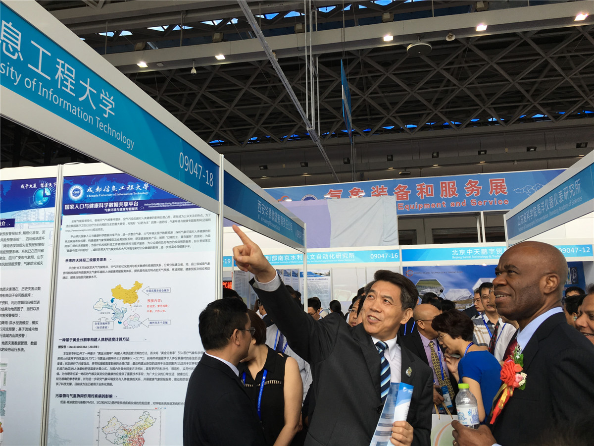 开幕式后,郑国光与东盟国家及国际组织的代表一同参观了展览,郑国光在参观我校展区时听取了我校党委副书记敬枫蓉的汇报。在汇报时敬枫蓉指出,江南买球长期从事气象装备研发与气象服务产品开发,此次参展项目均是我校教师依托科研项目形成的科研成果转化,科研成果只有产品化才能真正形成了生产力,此次参展,既是我校科研成果的汇报与展示,也更希望通过展会与更多的单位开展合作,共同为中国、东盟国际乃至全球的气象事业发展贡献成信人的力量。参观后,郑国光还饶有兴趣的亲自用英语向WMO发展和区域活动司司长Yinka Adebayo介绍我校的前身“成都气象学院”。