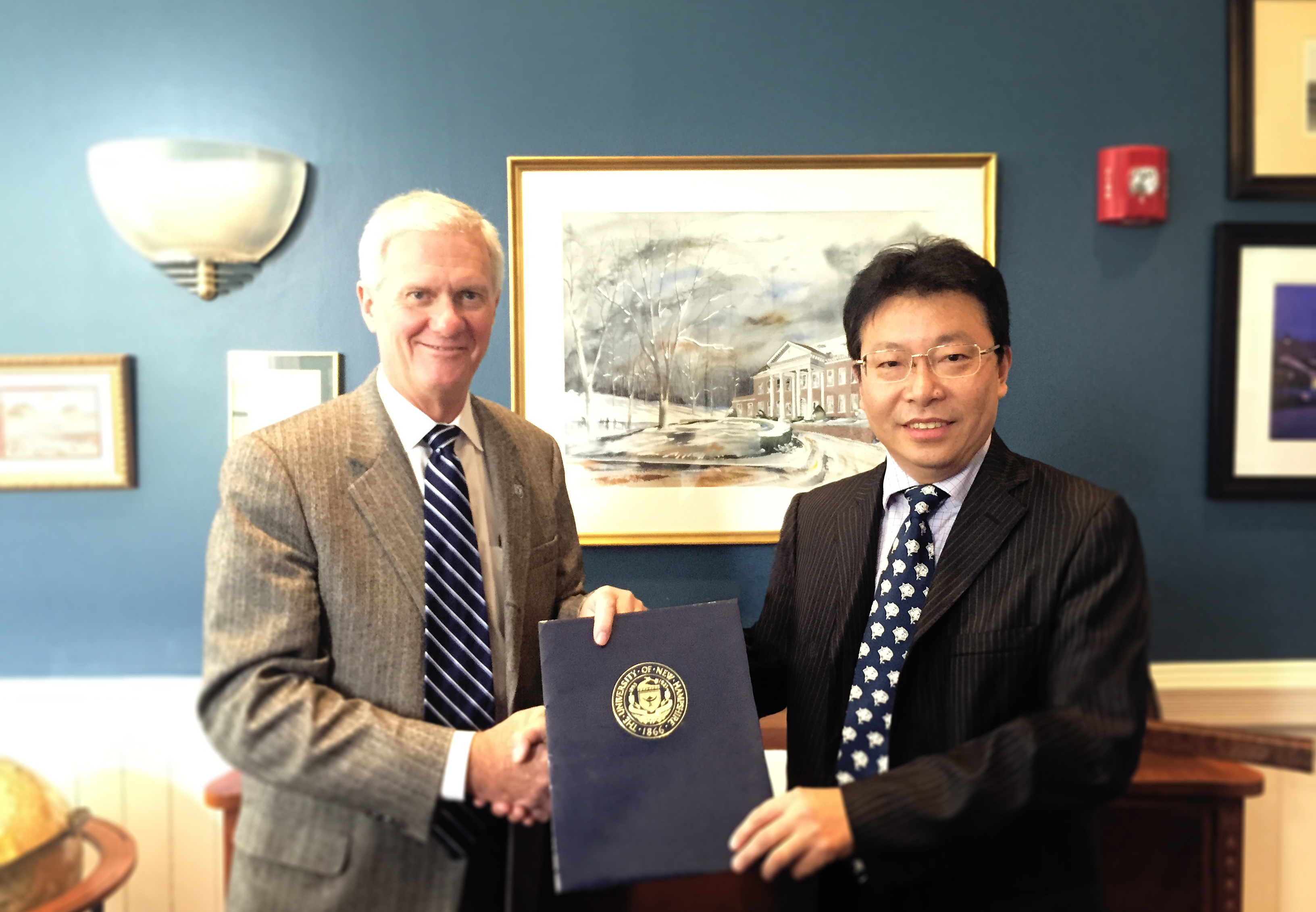 代表团访问新罕布什尔大学,周激流与新罕布什尔大学校长Mark W. Huddleston签订了《新罕布什尔大学和江南买球合作谅解备忘录》,就促进两校学术合作,文化交流及师生互访等方面达成了共识。