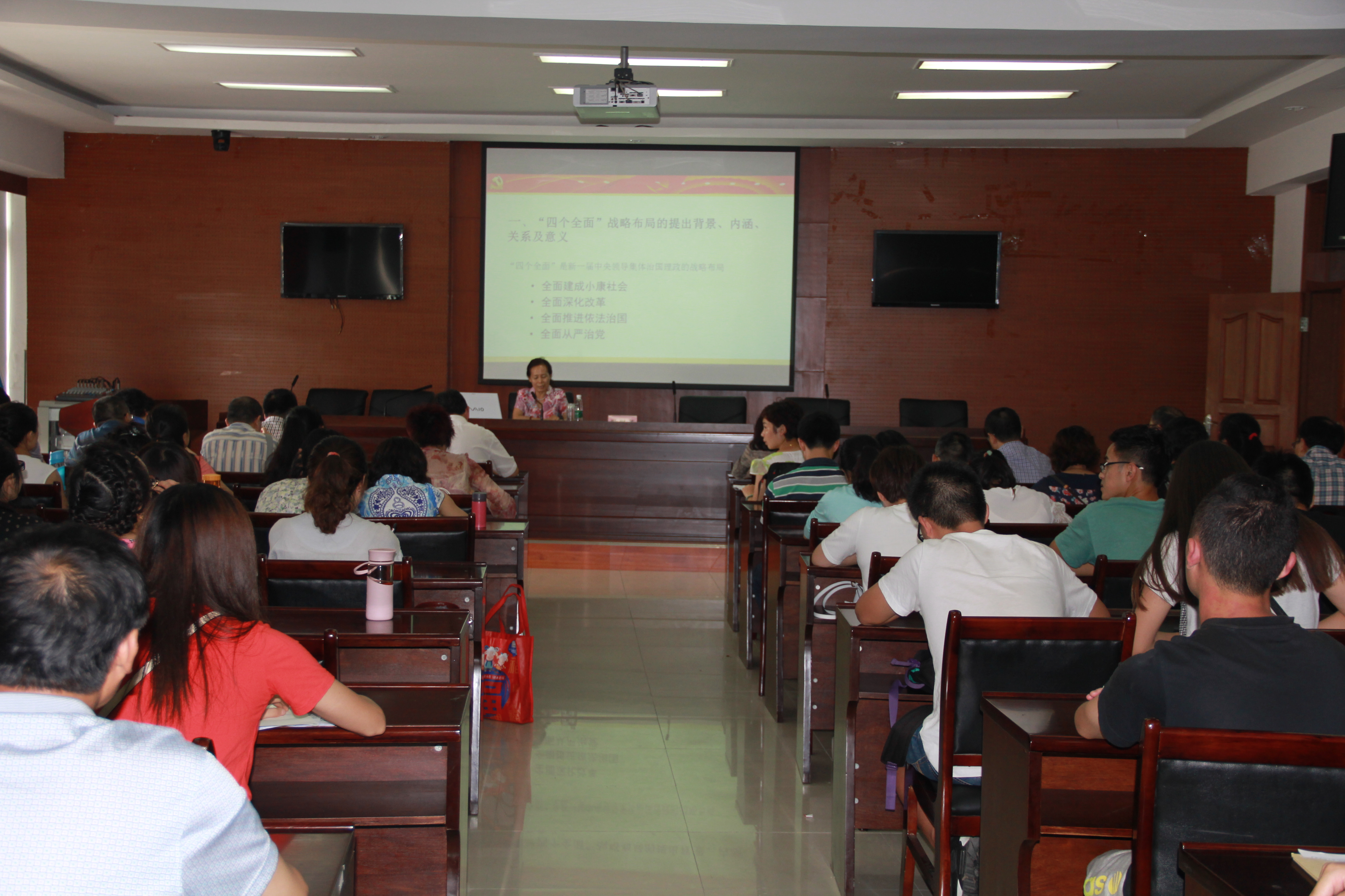【本网讯】7月9日下午,学校党委副书记敬枫蓉在龙泉校区1201教室为商学院班子成员、全体教职工党员和部分学生党员代表作了题为《深入学习“四个全面”战略布局,坚持从严治党》的专题党课。党课由商学院党总支书记李家玉主持。
