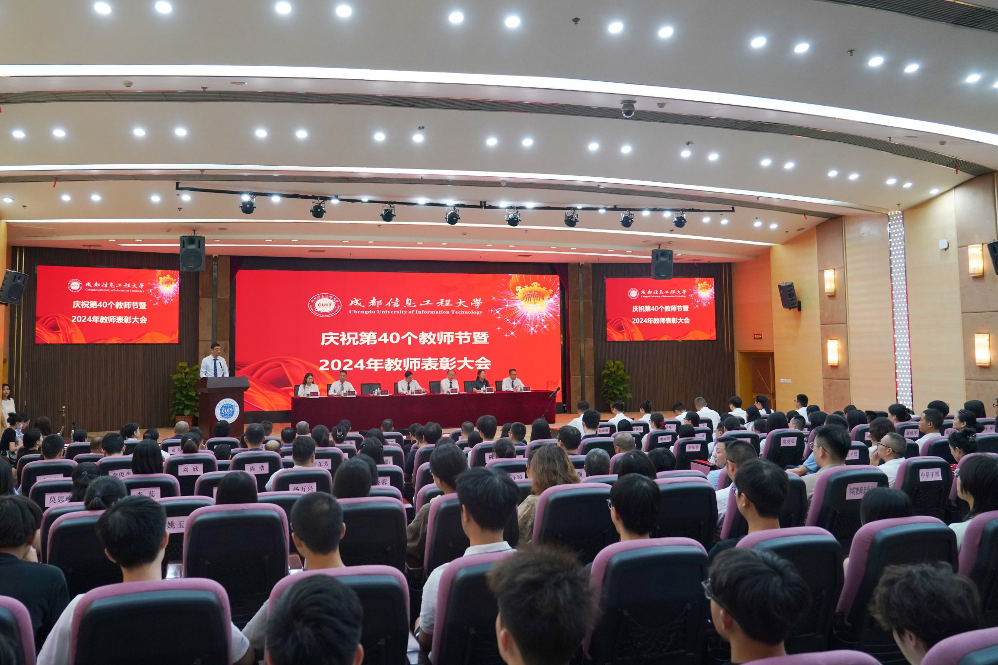 【本网讯】9月10日上午,学校庆祝第40个教师节暨2024年教师表彰大会在航空港校区国际会议厅隆重召开。全体校领导,各二级党组织书记、各职能部门负责人、各学院(中心、部)负责人、各业务与产业部门负责人,受表彰教师、师生代表参加会议。学校副校长吴锡主持会议。