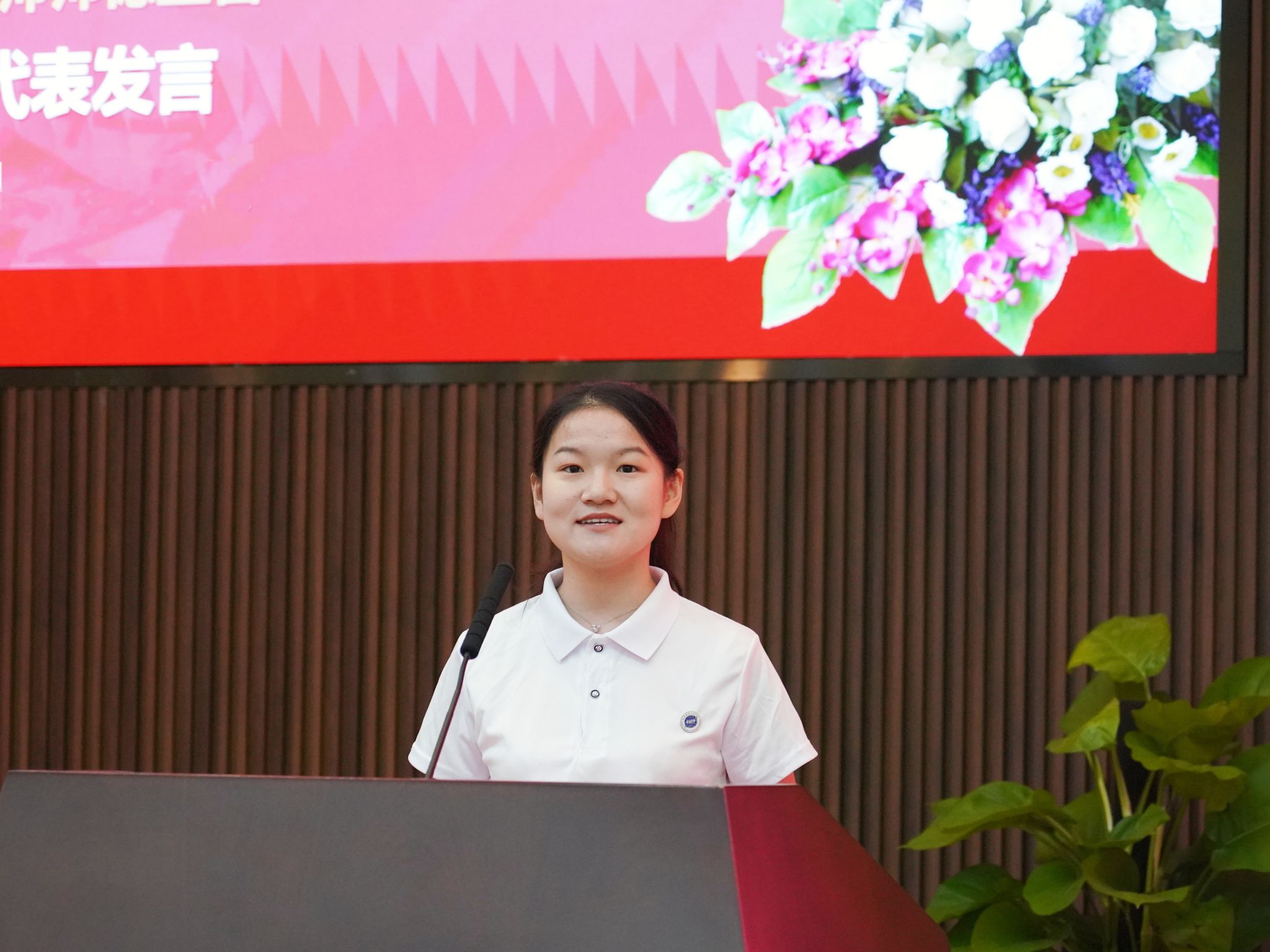 大气科学学院2021级本科生闫纡含作为学生代表发言。她代表全体成信学子,向所有无私奉献、辛勤工作的老师们致以最崇高的敬意和最诚挚的节日祝福。她表示,要牢记学校对同学们的殷切希望,将所知所学应用于实践,成为有益于社会、服务于社会、奉献于社会的新一代成信青年。