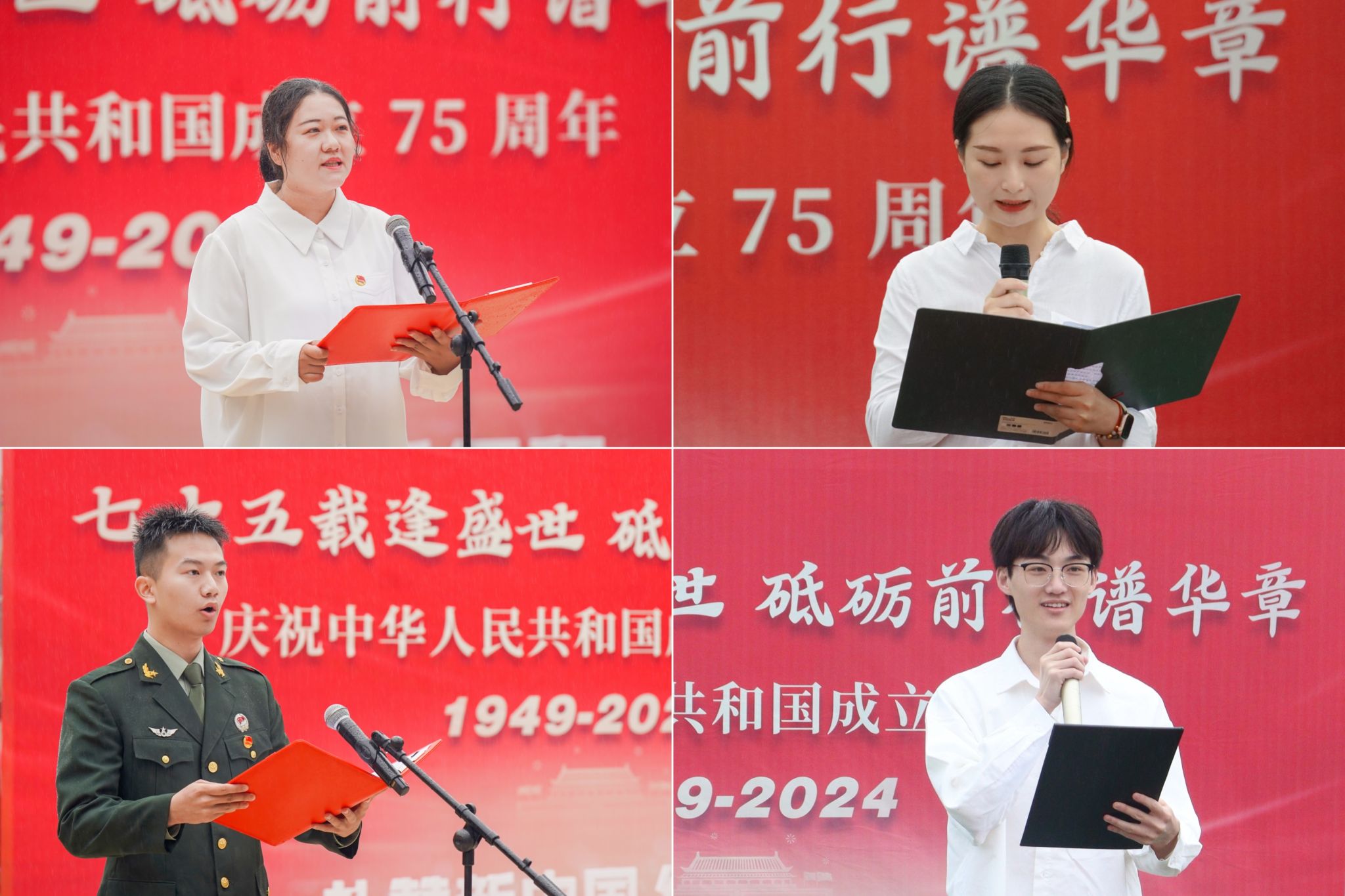 大气科学学院苏露、管理学院雷媛代表全体教师发言,礼赞新中国75年来的伟大成就。她们表示,作为一线工作的青年教师,深知教育对于国家和民族的重要性,未来要以先辈们为榜样,用自己的言行,传递正能量,激发青年学生的奋斗精神,引导他们勇敢追梦,不懈奋斗。软件工程学院2022级吴浩然、管理学院2021级王智弘作为学生代表发言。他们深情告白伟大祖国,表达了树立远大理想的决心和听党话、感党恩、跟党走的坚定信念,未来要胸怀强国之志,锤炼强国之技,融入强国之功,将以昂扬向上、不懈奋斗的姿态接过强国建设、民族复兴的历史接力棒,砥砺推进中国式现代化建设。