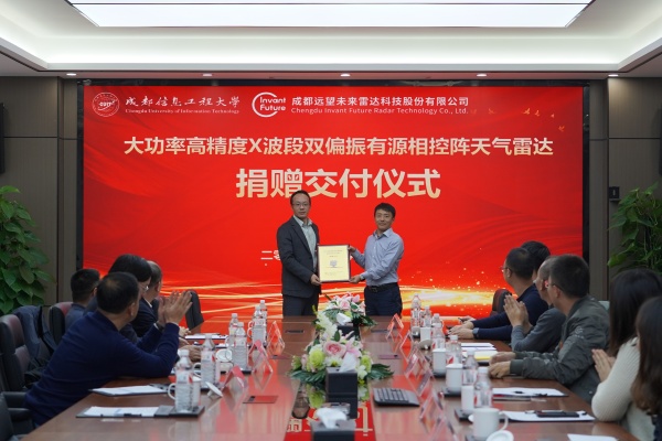 随后,在双方领导共同见证下完成了大功率高精度X波段双偏振有源相控天气雷达的捐赠交付仪式。这台雷达将为学校在气象研究、气象预报、数据采集等方面提供重要的技术支持,助力学校在相关领域的科研突破与学科建设。