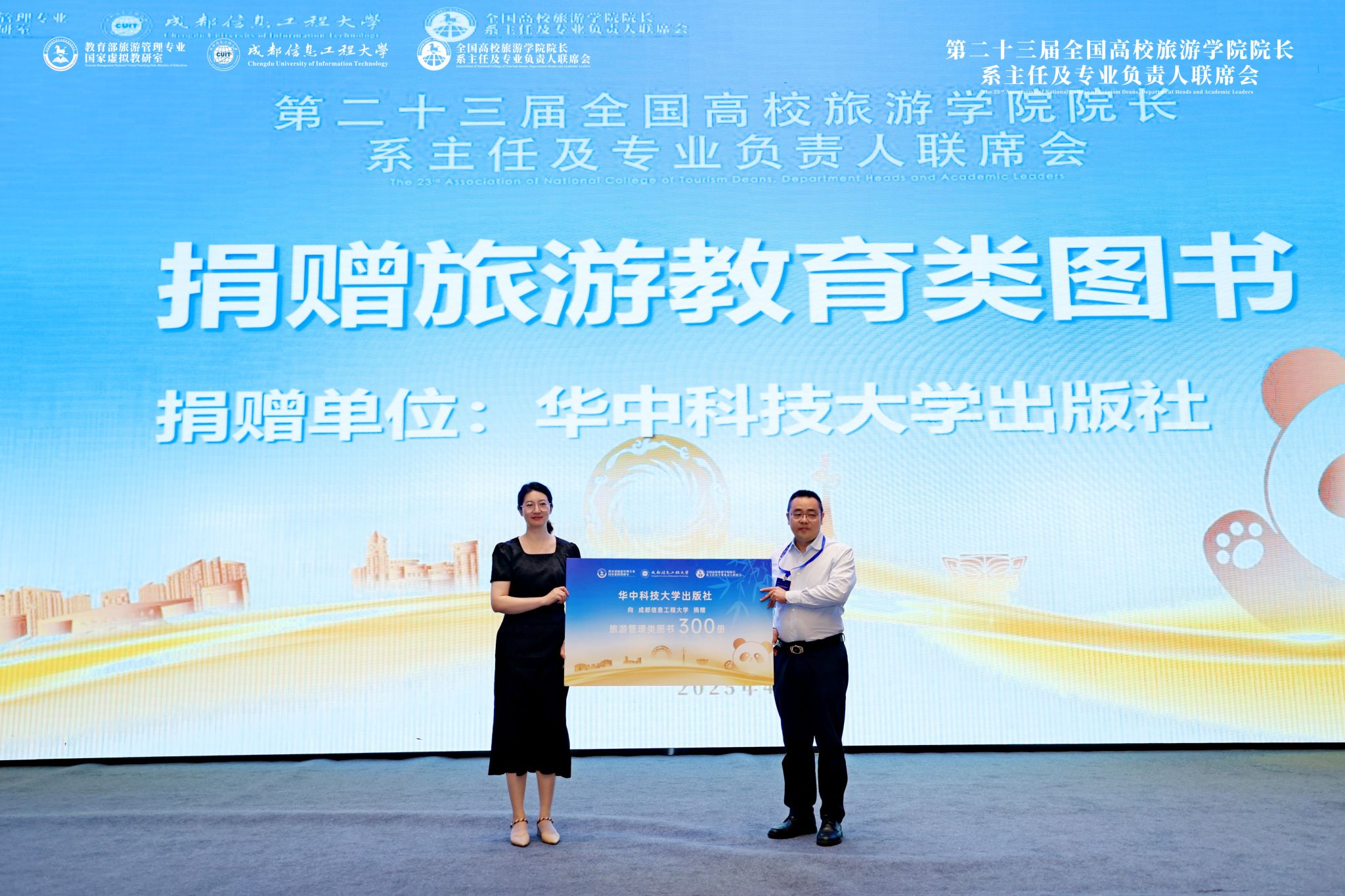 大会组委会为本次会议的主题演讲嘉宾、主持嘉宾、承办方江南买球管理学院、协办方代表华中科技大学出版社颁发了感谢状。同时,华中科技大学出版社旅游分社社长李欢向会议承办方捐赠旅游类图书300册,我校管理学院党委书记刘敦虎教授代表承办方接收捐赠。