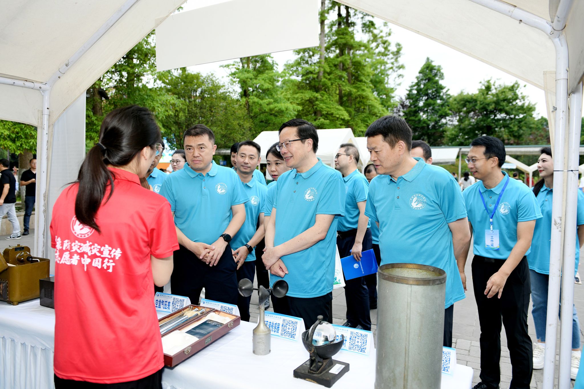 当天下午,与会领导和嘉宾到都江堰市抗震救灾恢复重建陈列馆气象防灾减灾现场学习。气象科普专家和大学生志愿者到都江堰市李冰中学开展气象科普进校园活动。