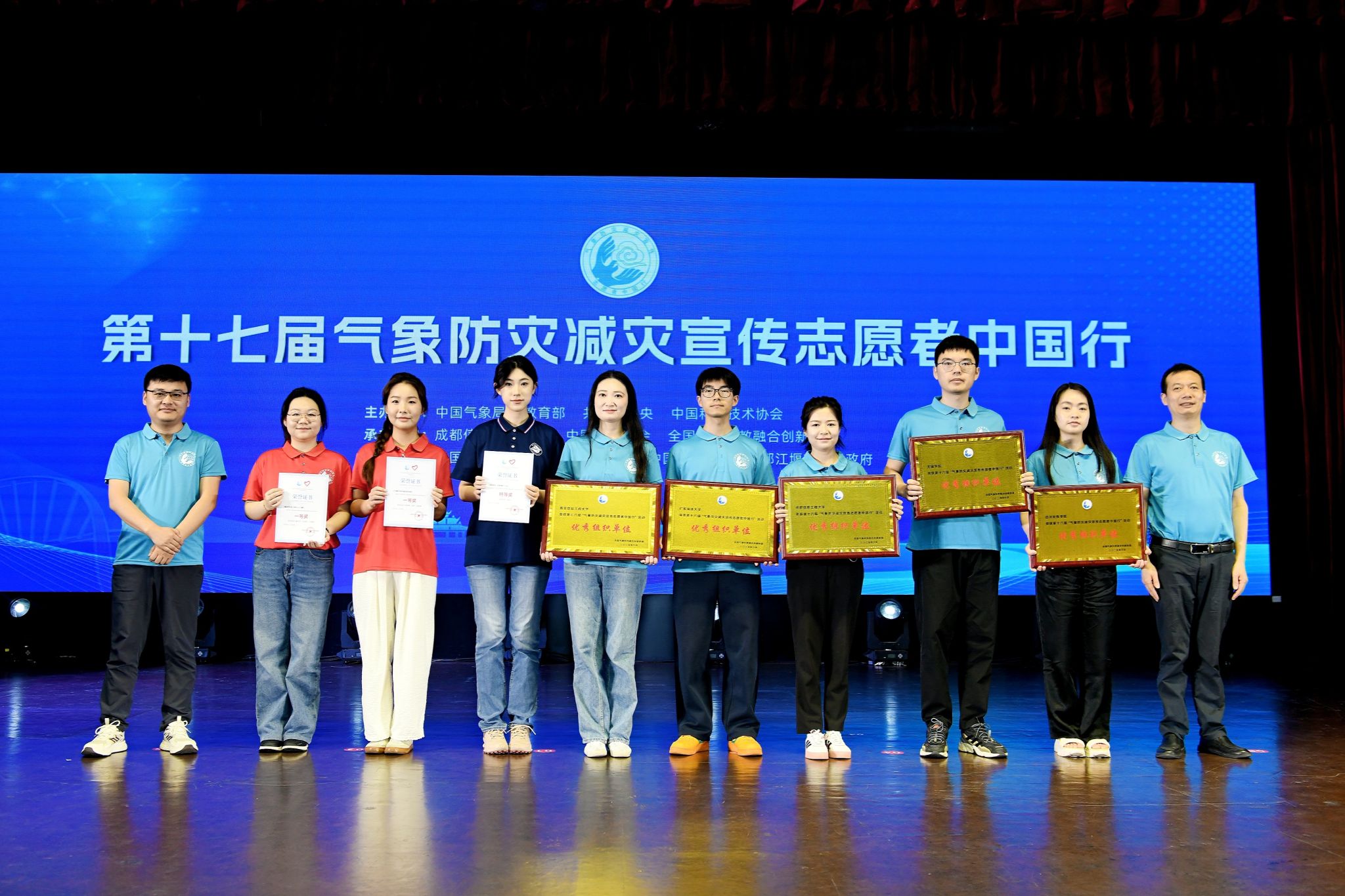 刘文泉宣读第十六届“气象防灾减灾宣传志愿者中国行”活动表彰名单。第十六届活动共遴选组织来自45所高校的144支队伍奔赴全国各地开展气象防灾减灾科普宣传社会实践活动,活动组委会评选出优秀组织单位5个,优秀志愿者队伍特等奖1个、一等奖5个、二等奖10个、三等奖12个、优秀奖12个、最佳活动效果奖1个、最佳宣传效果奖1个、最佳创意奖1个。