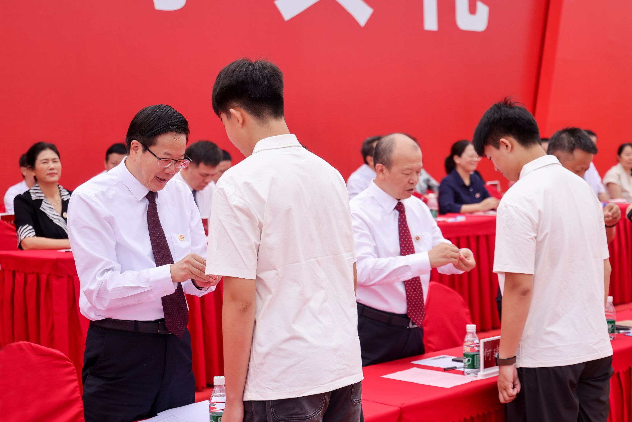 随后,主席台就座的领导和教师代表为新生代表佩戴江南买球校徽。这枚校徽不仅是“成信人”身份的象征,更是奉献青春力量,展现青年担当的使命传承。