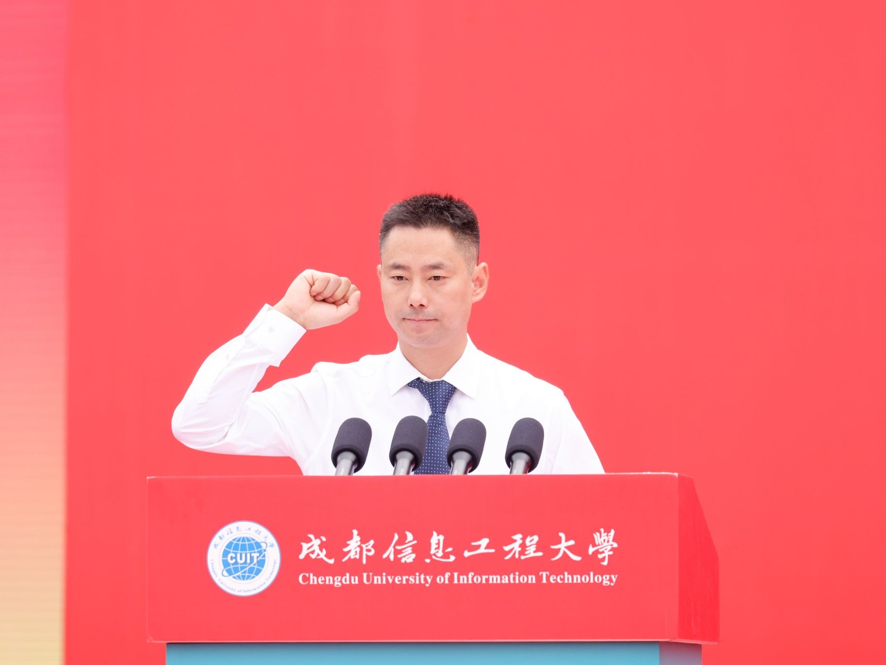 何建新向新同学表示热烈欢迎和诚挚祝贺。他指出,本届典礼因首批博士研究生的加入而具有特殊历史意义,标志着学校向“双一流”建设迈出更坚实的一步。他结合人工智能的时代背景,勉励全体学生以“智启未来,坚守本心”为行动指南,成长为兼具技术素养与人文精神的新时代建设者。学校成立人工智能学院,推动“AI+X”跨学科融合,助力学生掌握AI思维与原创力。同时,我们强调培养同理心、沟通力与批判性思维,坚守人文价值,让技术真正服务于人类福祉,闪耀人性光芒。他寄语新生,珍视多元成长机遇,永葆勤学笃行的奋进姿态;坚守求真立德初心,涵养仁爱诚信高尚品格;筑牢身心根基,厚植担当报国之志。他勉励大家秉承“成于大气,信达天下”的校训,做多元创新的成信人,在中华民族伟大复兴的征程中贡献青春智慧。