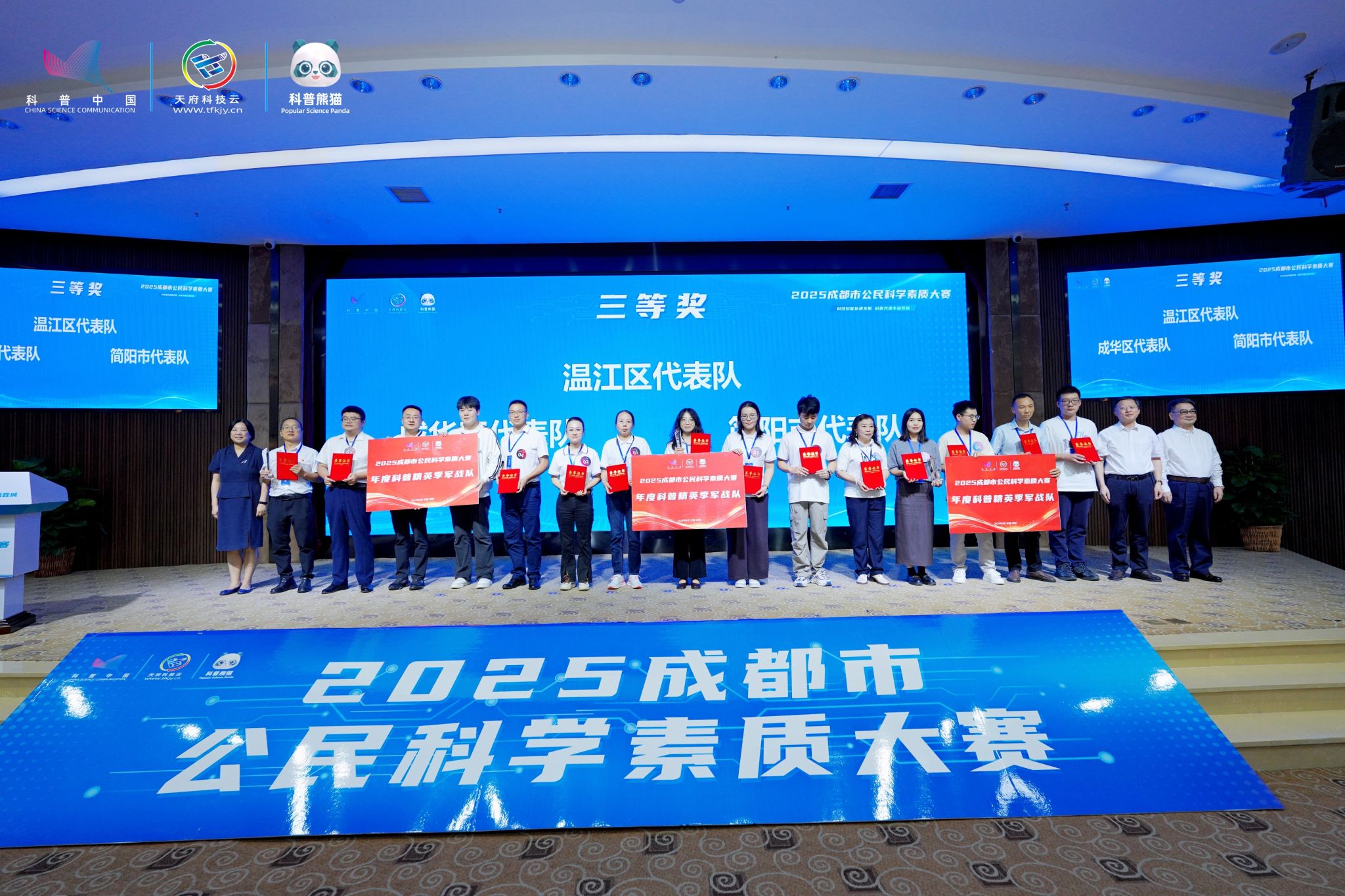 本次大赛创新采用“线上+线下”联动模式,充分展现了成都市民“讲科学、爱科学、用科学”的精神风貌。大赛自7月启动以来,吸引了近10万人次参与线上答题,活动总浏览量突破27万次,成为近年来成都市参与面最广、影响力最大的科普盛事之一。经过层层选拔,来自全市的23支队伍中的6支精英团队晋级决赛。总决赛共设科普展演、必答题、抢答题、风险题四个环节,全面考察选手的科学知识储备、应变能力、表达能力与团队协作精神。比赛现场,选手们以扎实的科学素养、敏捷的思维反应和出色的舞台表现,赢得了评委和观众的阵阵掌声。最终双流区代表队优异成绩荣获一等奖,锦江区代表队和郫都区代表队获得二等奖,温江区代表队、成华区代表队和简阳市代表队获得三等奖。