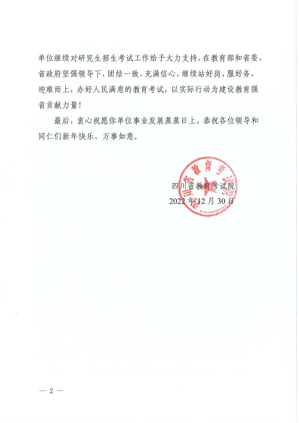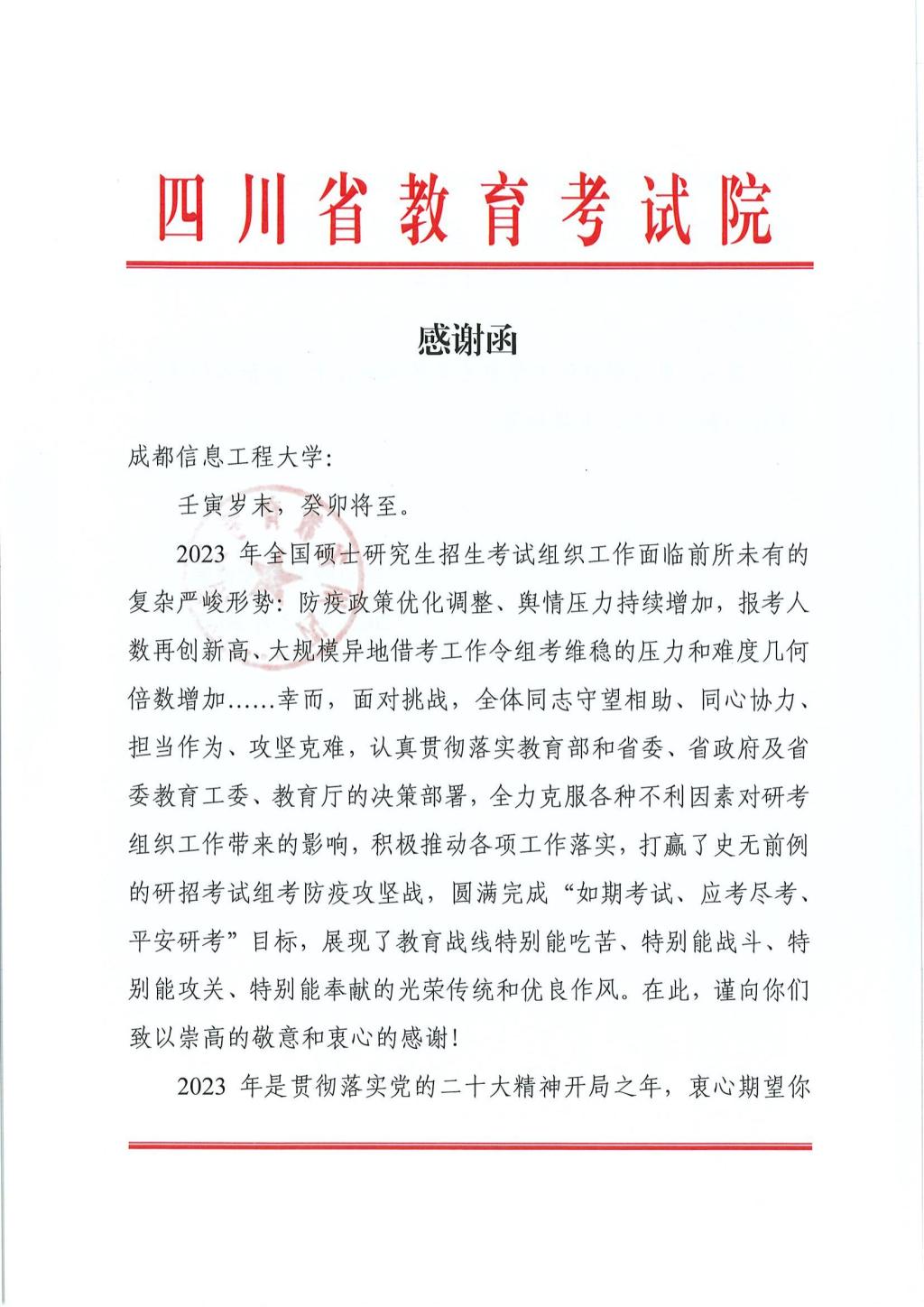 【本网讯】近日,四川省教育考试院向我校发来感谢信,对我校认真贯彻落实教育部及四川省教育厅决策部署,高质量落实完成2023年全国硕士研究生招生考试防疫组考工作给予高度认可和积极鼓励。