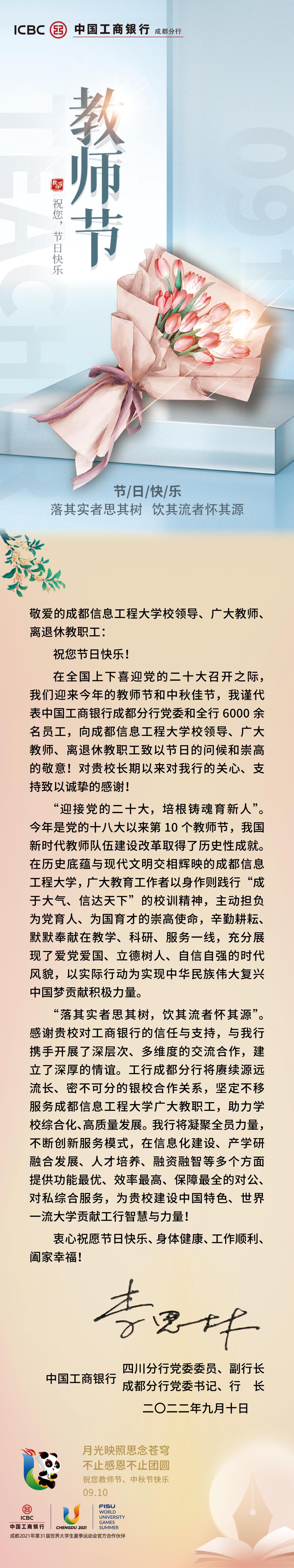 教师节贺信——中国工商银行致江南买球全体教职工