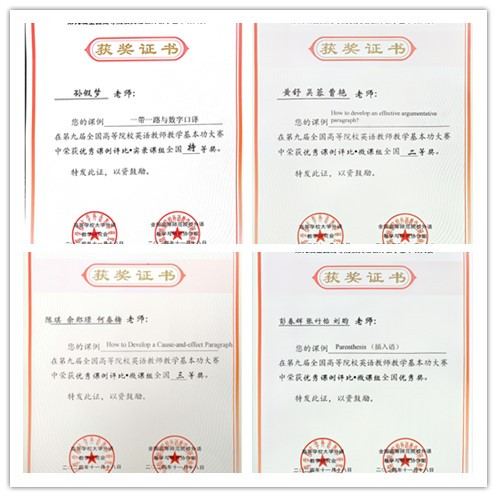 【本网讯】近日,第九届全国高等院校英语教师教学基本功大赛结果揭晓,我校外国语学院教师喜获四项全国奖项、三项省级奖项。孙假梦获得实录课组全国特等奖,黄舒、吴蓉、曹艳教师团队获得微课组全国二等奖,陈琪、余郑璟、何春梅教师团队获得微课组全国三等奖,彭春辉、张竹怡、刘昀教师团队获得微课组全国优秀奖。王春莉获得说课组省级二等奖,宋洁琳和彭春辉获得说课组省级三等奖。黄驰获得优秀指导教师奖。