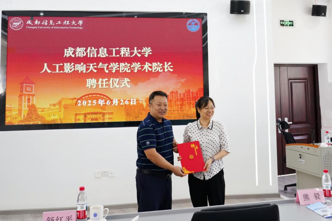 会议期间举行了聘任仪式。舒红平向中国气象局人影中心楼小凤研究员颁发了人工影响天气学院学术院长聘书,此举将进一步强化学科专业建设支撑引领。