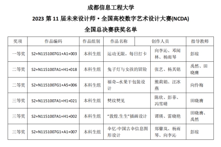 【本网讯】近日,第11届未来设计师·全国高校数字艺术设计大赛(NCDA)圆满落下帷幕,我校学子在本次大赛中喜获佳绩,荣获国家级一等奖1项、二等奖2项、三等奖3项;省级一等奖11项、二等奖13项、三等奖24项,吴双翼、田晓膺、向伶梅、禹然获得优秀指导教师称号。