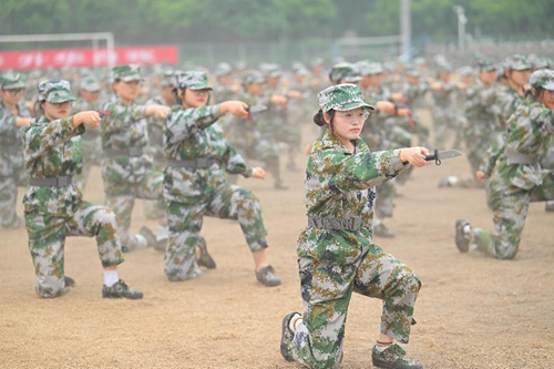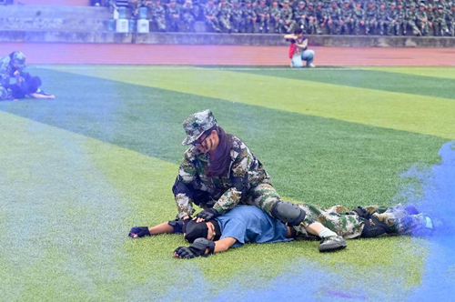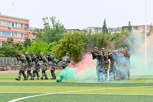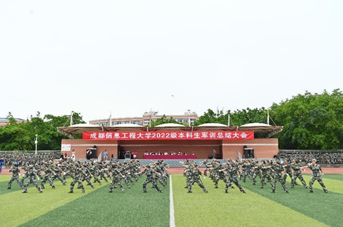汇报表演伴随着《分列式进行曲》拉开帷幕。标兵就位,迈着矫健的步伐引领着方队依次通过主席台接受领导的检阅。他们队列整齐、口号响亮、朝气蓬勃、斗志昂扬,充分展现了我校2022级学生奋发向上的精神风貌和军训工作的丰硕成果。同学们沉着、自信的精神面貌赢得了现场师生的阵阵掌声;分列式方队井然有序、整齐划一的步伐,热烈的青春肆意挥洒在洪亮的口号声里;匕首操方队的迅猛刺激、身姿挺拔,彰显着军营之花的英姿飒爽和青春魅力;特种战术方队在爆破声响中迅捷行动,在硝烟弥漫中昂首向前,他们从容不迫,展现铮铮军魂,他们脚步变换,尽显飒爽英姿;刚劲有力的擒敌拳,是学子们热情勇毅与追求卓越的印证;铿锵有力的应急棍,表现了学子们不畏困苦的英勇气魄;同学们用花式队列摆出“CUIT”、“中国地图”等图样的队形,表达了成信学子对党和祖国的热爱以及对学校的祝福,同学们步伐整齐、热情饱满、斗志昂扬,展现了成信学子锐意进取、追求卓越的精神风貌。