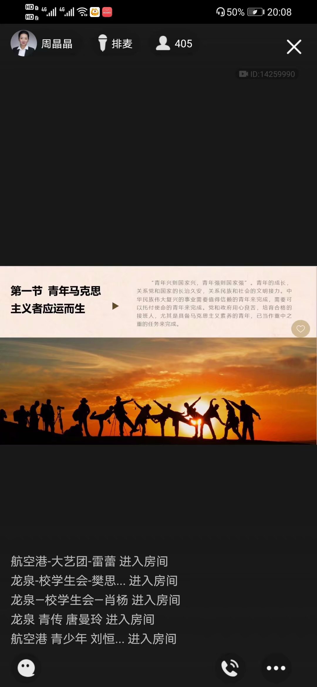 【本网讯】为加强疫情防控时期对我校广大团员青年的思想政治引领,凝聚青年学生抗击疫情的力量,4月12日晚19:00,我校2020年青马工程青春战“疫”云团课特别培训班第一课在线开讲。学校团委兼职副书记、马克思主义学院教师周晶晶担任主讲。校团委相关负责人、学生干部代表、青马工程青春战“疫”云团课特别培训班全体学员400余人参加了本次学习。