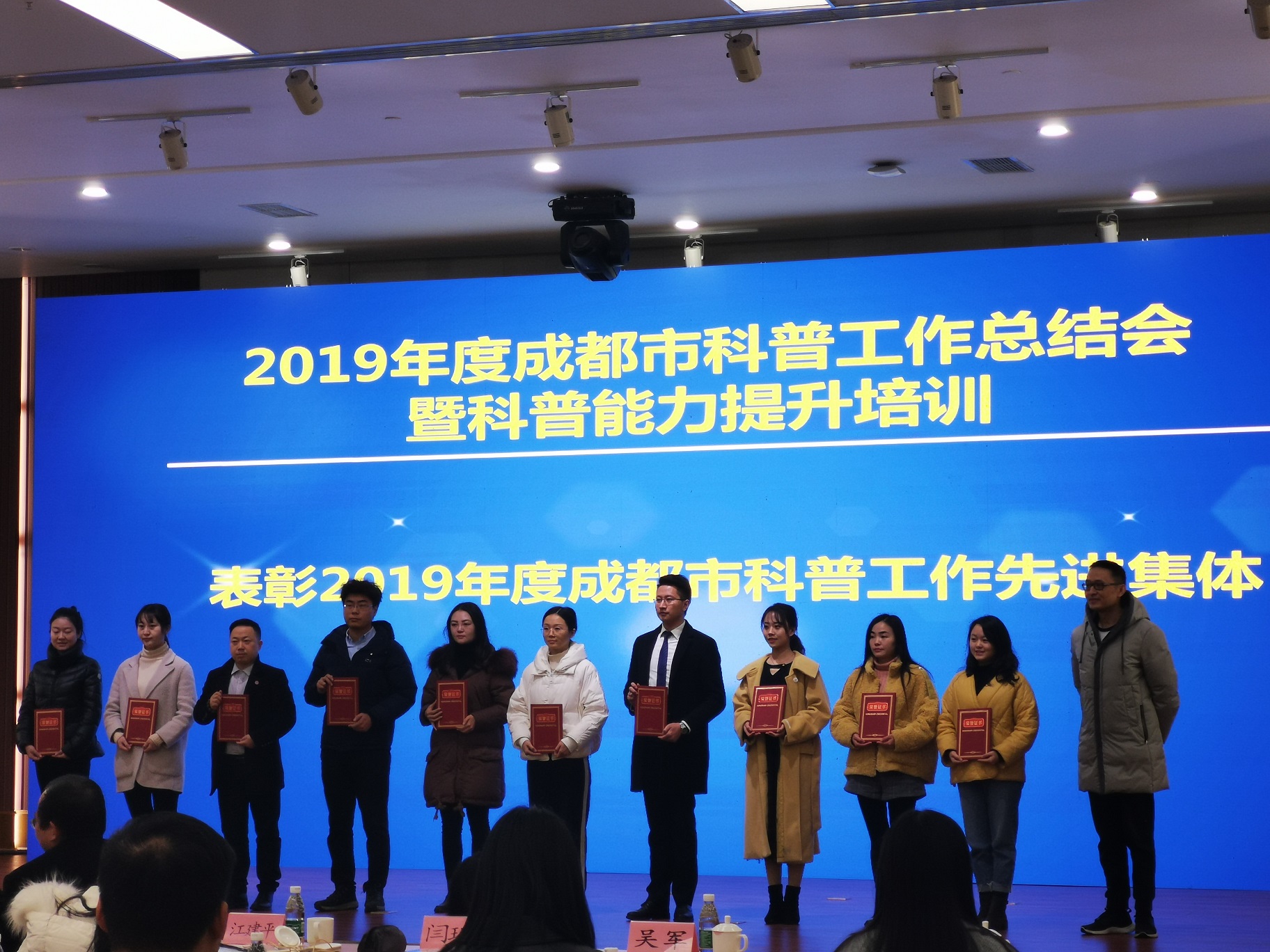 会议由成都市科普教育基地联合会秘书长龚明霞主持,成都市科技局社会发展与农村科技处处长肖骏总结了2019年全市科普工作,成都市科技局巡视员马良乾对2019年新命名的科普基地进行授牌,表彰了2019年科普工作先进集体和先进个人。我校智能机器人创客科普基地荣获2019年科普工作先进集体荣誉称号,黄小燕荣获先进个人荣誉称号。此外,先进集体代表成都三和汽车科普馆、清波社区分享了科普基地及“蓉城社区创新屋”建设经验。