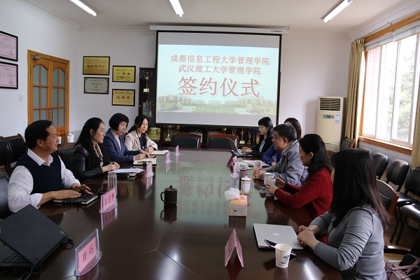 【本网讯】近日,我校管理学院与武汉理工大学管理学院友好合作备忘录签字仪式在龙泉校区第二行政楼三会议室举行。我校党政办公室主任段黔冰、管理学院院长黄萍、党委书记王子华、副院长孙艳玲、李贵卿,党委副书记李璘来,武汉理工大学管理学院王爱民、圣三一大卫学院项目负责人邱欣及相关人员参加签字仪式。