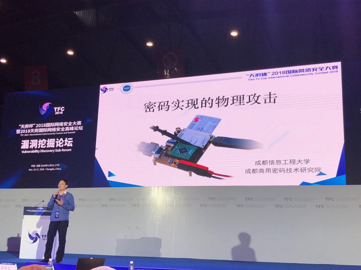 我校网络空间安全学院副教授、成都商用密码技术研究院院长吴震作为密码学专家应邀参加会议,并在漏洞挖掘论坛进行了主题为“密码实现的物理攻击”专题演讲。他从密码算法、现实、安全和针对密码现实的攻击实例与被动攻击等方面,对密码实现的物理攻击做了全面分析,并指出了一些关于密码安全性的探索方向。