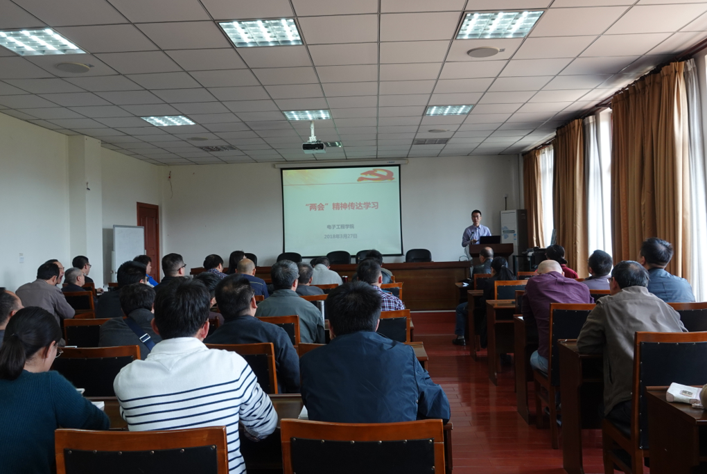 【本网讯】3月27日下午,电子工程学院召开政治学习会,传达学习党的十九届二中全会、三中全会,习近平总书记来川视察重要讲话和两会精神。电子工程学院全体教师党员、全体教职工参加学习会。学习会由电子工程学院党总支书记高永华主持。