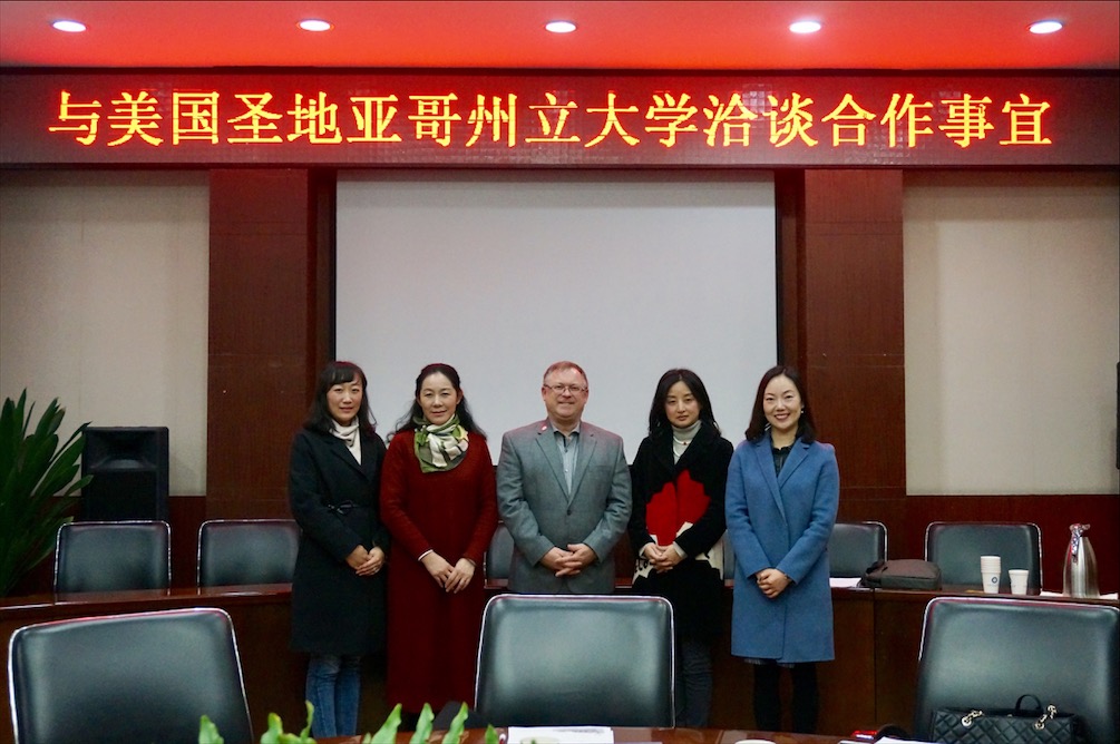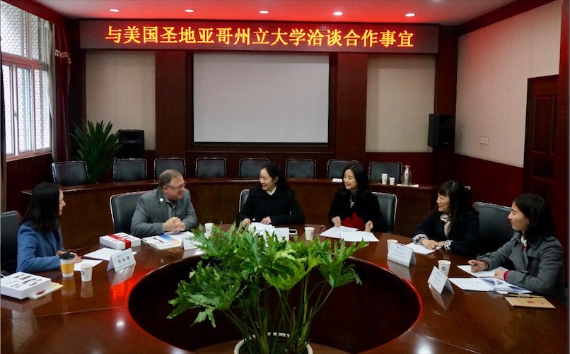 会上,黄萍对来访客人表示热烈欢迎,她介绍了我校管理学院基本情况及现有合作项目。Brian Blake介绍了美国圣地亚哥州立大学学生交流项目及教师培训项目的基本情况。他希望能通过两校的积极探讨,展开双方的友好交流与合作,并欢迎我校师生到圣地亚哥州立大学访问学习。参会人员就双方如何开展中外合作办学项目展开了深入探讨,为后期的合作奠定了良好的基础。