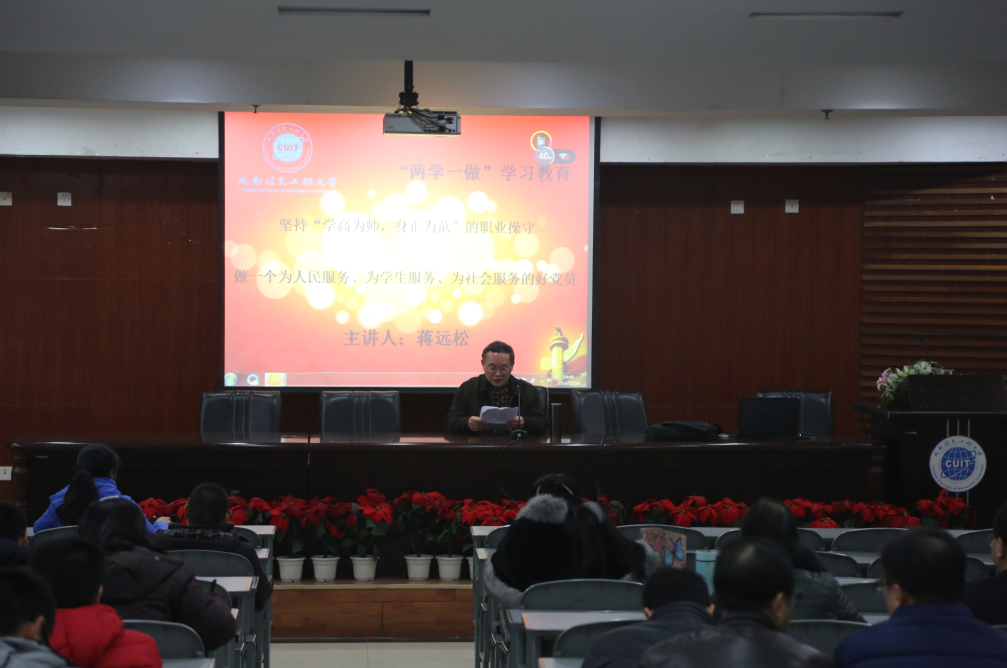 【本网讯】12月19日下午,按照学校“两学一做”办公室的统一安排,我校优秀退休党员蒋远松同志在学术报告厅为教师党员上“两学一做”学习教育党课,党课由离退休党总支书记赵丽华同志主持。