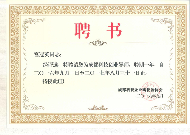 大会还举行了成都科技创业导师聘任仪式,评选出了第一批103名成都科技创业导师。据了解,成都科技创业导师是经各区(市)县科技部门、各创新创业载体、各服务机构推荐及个人自荐,由中国火炬创业导师、2015年度“菁蓉创业导师”组成的专家组评审评选出来的(其中包括中国火炬创业导师23名)。成创空间CEO宫冠英凭借其丰富的孵化器创业导师和天使投资等行业经历,被聘为成都科技创业导师。