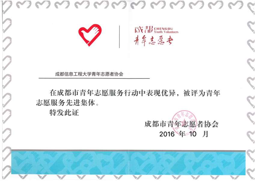 【本网讯】近日,成都市青年志愿者协会下发了《关于表扬2015年度成都市青年志愿者行动先进集体、项目及个人的决定》(成青协【2016】8号),对成都市182个青年志愿服务先进集体、311名优秀青年志愿者、131项优秀青年志愿服务项目给予通报表扬。我校青年志愿者协会、我校青年志愿者协会通信工程学院分会荣获“成都市青年志愿服务先进集体”称号,我校“青少年·伴童颜”特色课堂、“温暖独之心,享天伦之乐”特色项目荣获“成都市优秀青年志愿服务项目”,我校王定凤、王荣晶、牛腾、刘伟四位同学荣获的“成都市优秀青年志愿者”称号。