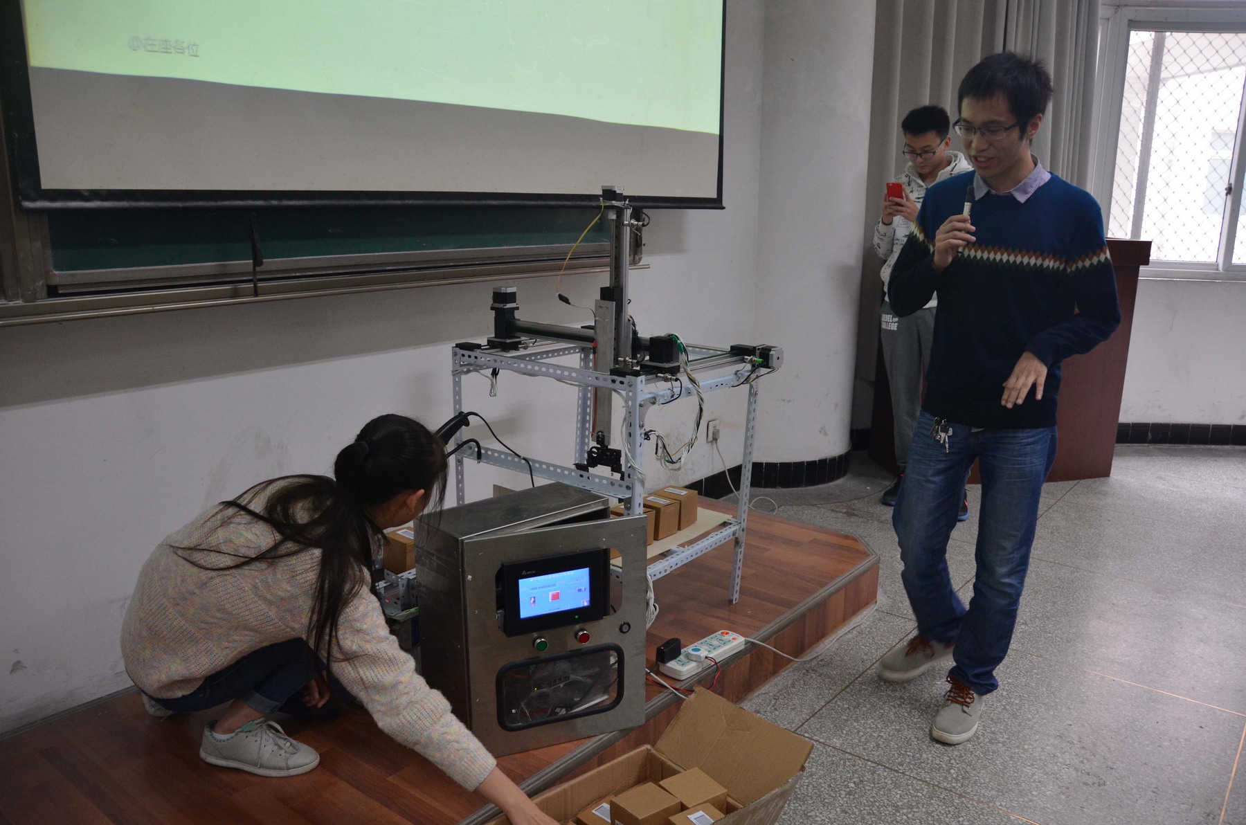 为了充分展示我院学生积极参加学科竞赛的优秀成果,14级机电专业薛皓天同学代表今年参加“发现智造高手”自动化大赛的两个项目组,向大家分享了参加比赛的历程及心得,对比赛的流程、比赛现场的氛围都作了详细介绍,展示了大量比赛的精彩画面,赢得了参会同学的一致赞叹;参赛成员向仕强、朱洪鑫等同学共同展示了“基于云平台的智能出货系统”、“中草药智能配取系统”两个成功作品;陈丹老师对赛事的影响力、校内校外的组织流程进行了说明,对2017年自动化设计大赛进行了动员宣传,鼓励同学们积极参赛,以此来培养自己的动手能力及团队协作能力。