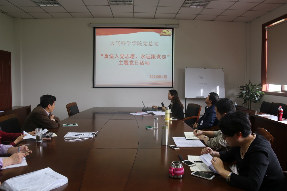 为深入学习贯彻习近平总书记系列重要讲话精神,将加强党的思想政治建设落到实处,结合学校《关于在全体党员中开展“两学一做”学习教育方案》文件精神,4月29日,大气科学学院教工党支部开展了“重温入党志愿,永远跟党走”主题党日活动。此次学习教育由大气科学学院党总支书记张小红主持,大气科学学院全体教师党员参加了活动。