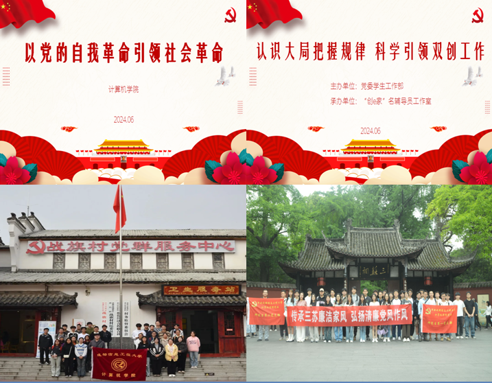 一是学院全面推进“大思政课”建设,构建“全专业推进、全过程贯穿、全课程融入”课程思政教学体系,打造系列思政课件融入学生一二课堂,如《以党的自我革命引领社会革命》《读懂中国式现代化》《认识大局把握规律,深刻理解和把握“第二个答案”的核心要义和精神实质》等。实施“时代新人铸魂工程”,上好“行走的大思政课”,带领学生追寻领袖足迹,走进战旗村、永丰村、三苏祠、三星堆等地,积极探索思政育人新载体,引导学生坚定理想信念,厚植家国情怀。二是学院顺利通过学校党建标杆学院及研究生样板支部创建的验收,有效发挥了党组织在学院各项事业发展中特别是人才培养中的政治引领、凝心聚力和组织保障作用。三是坚持党建带团建,持续开展学院“青年马克思主义者培养工程”团校培训班、“团学之光”大学生干部能力素养培训班,坚持不懈用习近平新时代中国特色社会主义思想的世界观和方法论为指导,做好大学生思想政治教育,实施新时代立德树人工程。