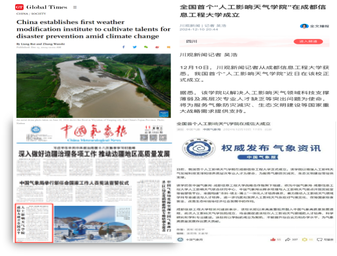 依托中国气象局-江南买球人工影响天气联合研究中心、中国气象局云降水物理与人工影响天气重点开放实验室等省部级平台,2024年12月10日在中国气象局-江南买球战略合作框架下组建了我国首个人工影响天气学院,引起了Global Times、中国气象报、川观新闻等各类媒体的广泛报道。学院以增强人工影响天气领域科技支撑和培养高层次专业人才为使命,全面构建”本科-硕士-博士"一体化人才培养体系,着力推动人工影响天气领域学科专业建设与人才培养,为服务气象防灾减灾、生态文明建设等提供支撑。