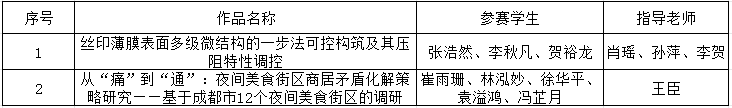 根据《关于组织开展第十九届“挑战杯”全国大学生课外学术科技作品竞赛的通知》要求,经过校赛、省赛的评审选拔,我校共2件作品被推报参加第十九届“挑战杯”全国大学生课外学术科技作品竞赛国赛主体赛,现对晋级国赛项目名单予以公示,名单如下: