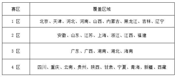 (三)分区赛阶段(2024年6月11日-6月30日)全国分为4个赛区,分区赛采用线上方式进行比赛。各省份和赛区的对应关系如下表所示,各赛道分区赛具体时间后续另行通知,敬请关注大赛官网。