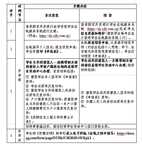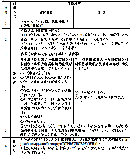 (五)为方便学生方便及时提交贷款回执信息,贷款机构为“国家开发银行”、“四川省农村信用社”的同学可以通过填写以下在线文档的形式提交相关回执信息,不必再提交纸质档。其他贷款机构的回执处理办法以贷款银行要求为准。