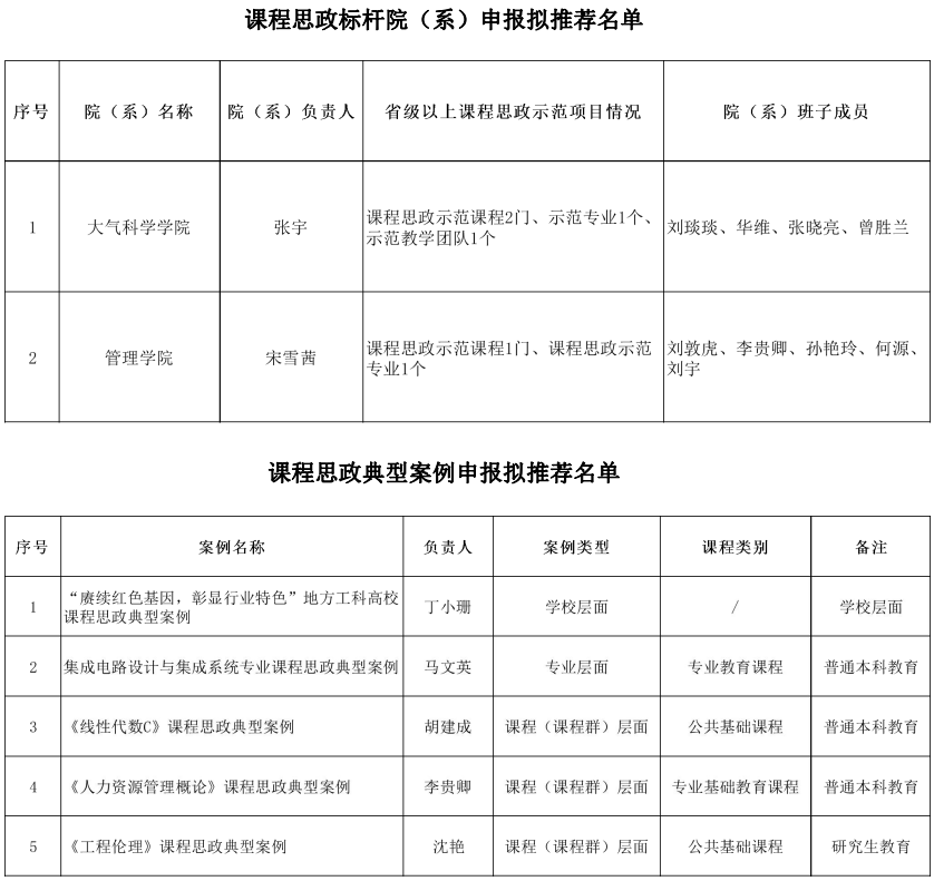 根据《四川省教育厅关于开展高等学校课程思政标杆院(系)和课程思政典型案例遴选工作的通知》文件要求,经各单位推荐、学校形式审查及校内专家评审,我校拟推荐大气科学学院、管理学院2个学院申报课程思政标杆院(系),“赓续红色基因,彰显行业特色”地方工科高校课程思政典型案例等5个案例申报课程思政典型案例,详细名单见下表。