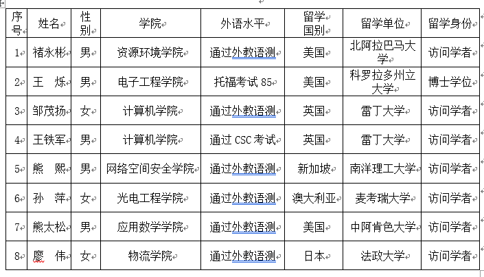 根据江南买球《教师中长期出国留学研修管理办法》(成信校发〔2018〕155号)文件的要求,我校2019年教师中长期出国(境)留学研修项目共录取8人。现将录取人员名单公布如下: