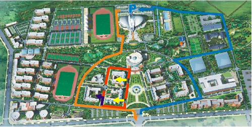 三、交通管制示意图(见附件)进校园请按照临时交通管制示意图安全行驶,“蓝色划线”区域为参加考试车辆往体育馆停车场行驶路线,考试期间实行单循环,“红色区域”为教学区警戒线,禁止人员进出, “橙色路线”为考试结束后车辆出口路线,"紫色路线"为考场唯一通道,由教师带队进入2教备考区,"黄色路线"为考务组进出路线。