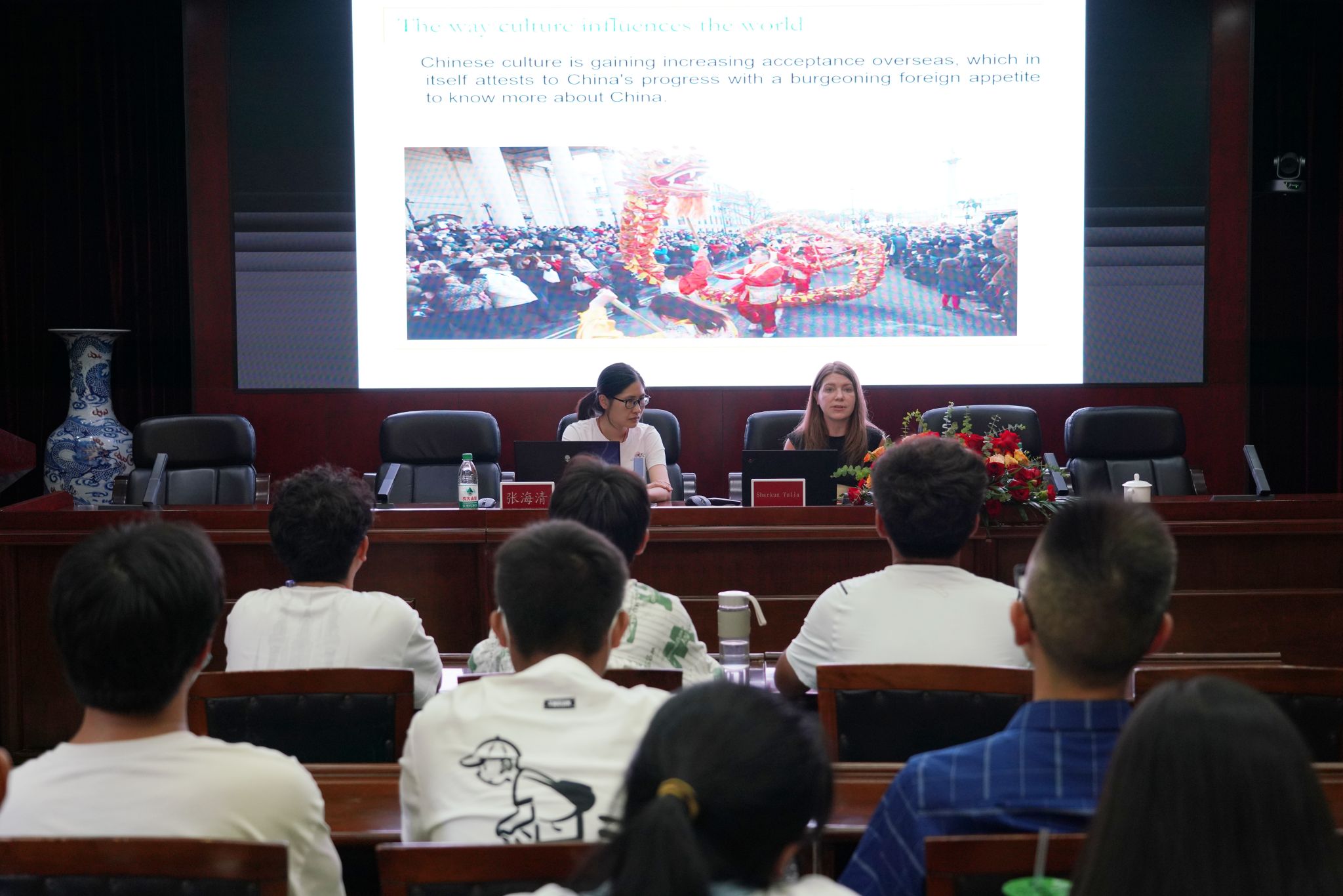 【本网讯】9月26日下午,由国际交流合作处主办的2024年“全球视野·共筑未来”国际教育周系列讲座活动在航空港校区行政楼第一会议室举办。来自外国语学院高端外籍专家、副教授Sharkun Yulia博士应邀来到活动现场,为航空港校区100余名师生带来了题为“Cultural fuency and lead across cultures”的学术讲座。讲座由软件工程学院张海清教授主持。