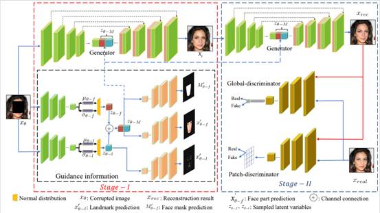 该项研究提出了通过预测人脸的结构、内容和轮廓信息并加以融合指导人脸补全FIFPNet方法。该方法是基于two-stage的方式完成人脸补全,在stage-I中,完成人脸信息的预测与融合,并填充人脸内容,在stage-II中,将stage-I中的补全结果和融合信息送入Stage-II,完成精细的人脸修复。该方法的结果超越了当前该领域的SOTA方法,具有优异的补全结果。