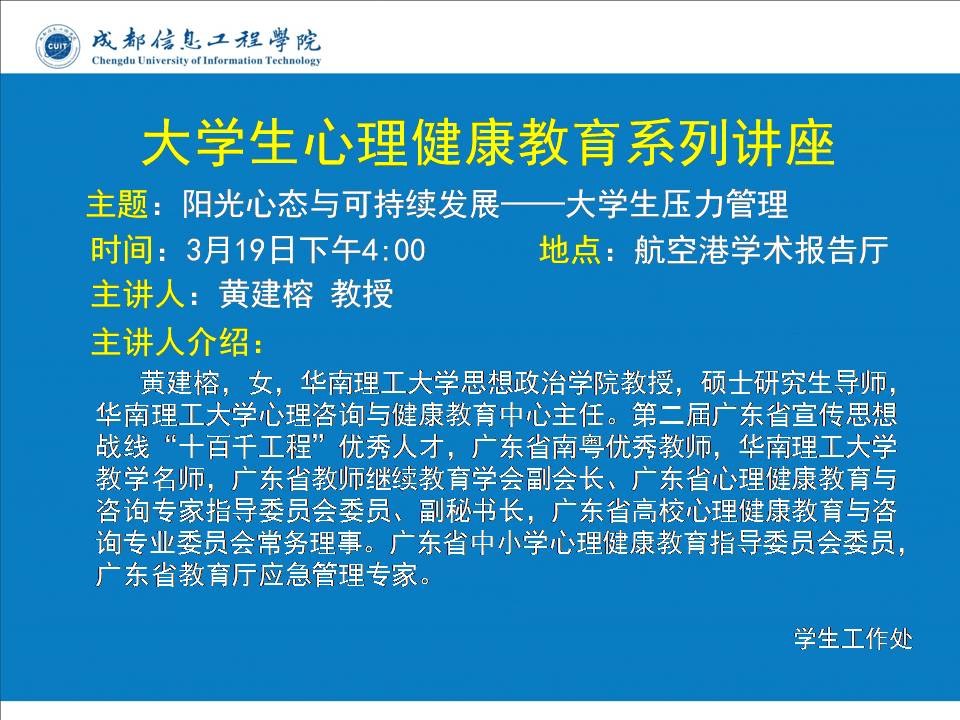 上一条:阳光心态与可持续发展——大学生压力管理讲座顺利举行