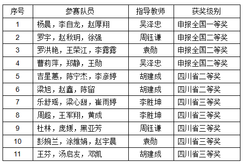 【本网讯】日前,从全国大学生数学建模竞赛四川赛区组委会获悉,“2017年高教社杯全国大学生数学建模竞赛”赛区成绩揭晓,我校有4支队伍推荐申报全国奖,其中1支队伍推荐申报全国一等奖,3支队伍推荐申报全国二等奖。同时,还有7支参赛队获得四川省二等奖和三等奖,成绩优异。详细名单如下。